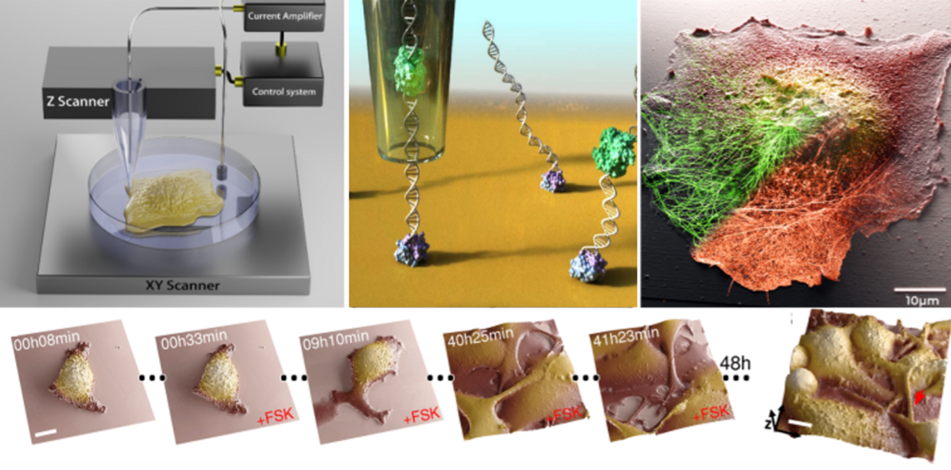 Scanning ion conductance microscopy (SICM) has been around for decades [1], yet it has not received as much attention as other forms of scanning probe microscopy. Recently, this true non-contact technique has kindled renewed interest among biophysicists and biologists because it is ideally suited for label-free imaging of fragile cell surfaces where it achieves exquisite resolution down to the nanometer regime without distorting the cell membrane [2,3]. SICM uses a glass nanopipette as a scanning probe and measures the current through the glass nanopore as a proximity detection of the sample surface. The challenge to harness this technique for time resolved 3D nanocharacterization of living cells lies in the relatively slow imaging speed of SICM. In this presentation I will show how we apply what we have learned from high-speed atomic force microscopy to the field of SICM. By reengineering the SICM microscope from the ground up, we were able to reduce the image acquisition time for SICM images from tens of minutes down to 0.5s while extending the imaging duration to days [4,5].