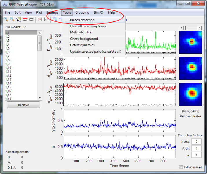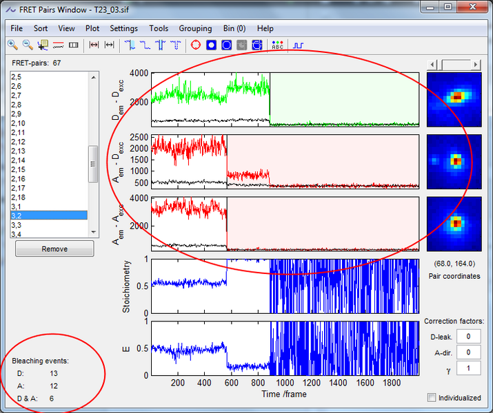 The algorithms start at the end of the trace and move towards the start, one frame at a time. When an intensity above the chosen threshold level is encounted more than x consecutive frames this is defined as a bleaching event.