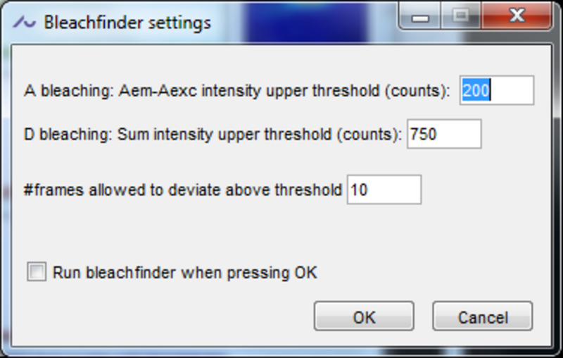 The optimal intensity threshold levels depend on your setup. For the detection of donor bleaching it is the sum of D and A intensities (on D excitation) that is used. For detection of acceptor bleaching it is the direct acceptor reference trace (AA) that is used in ALEX and the AD trace that is used in single-color mode. The traces are initially smoothed using a median filter.