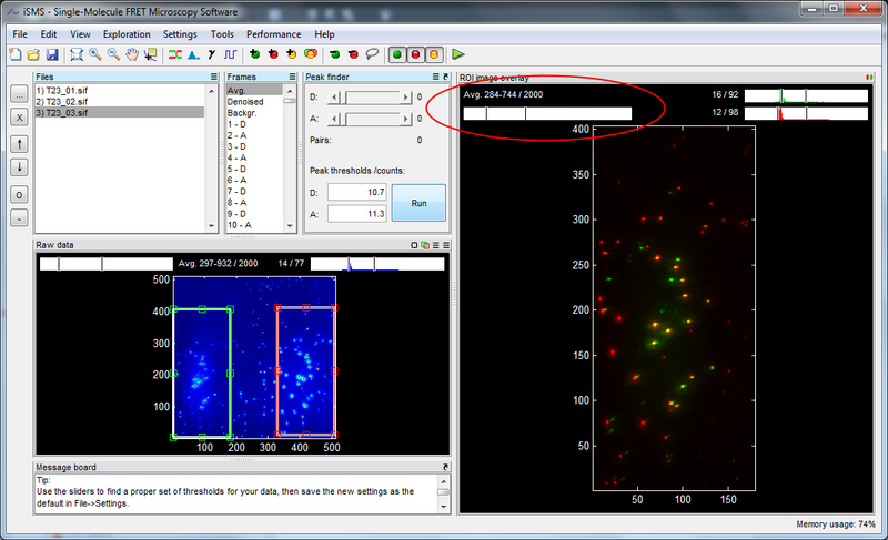 Use the frame slider above the overlay image to define the frame interval of the average image. The frame interval used for the average image is shown just above the slider. Widening the interval reduces noise but may also decrease peak intensities. The optimal image is characterized by a peak intensity signal-to-noise ratio as high as possible.