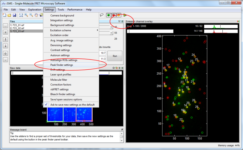 | Peak finder choice | The peak finder can either find peaks in the shown image or by scanning the entire movie. When scanning the entire movie the algorithm combines all FRET-pairs found through the movie. Scanning the movie always includes more false positives but may also include pairs not found by the single-image algorithmn. |