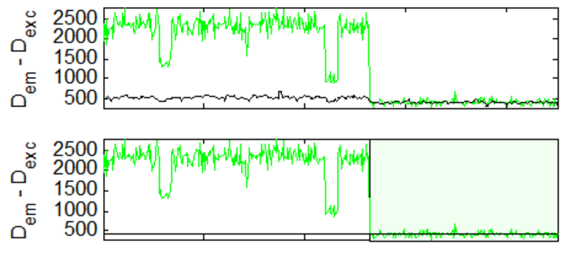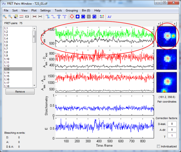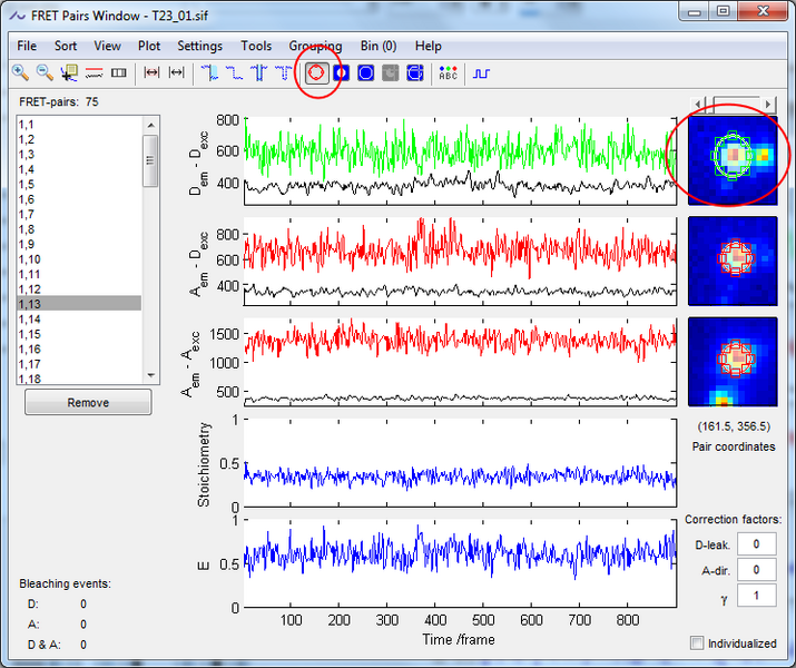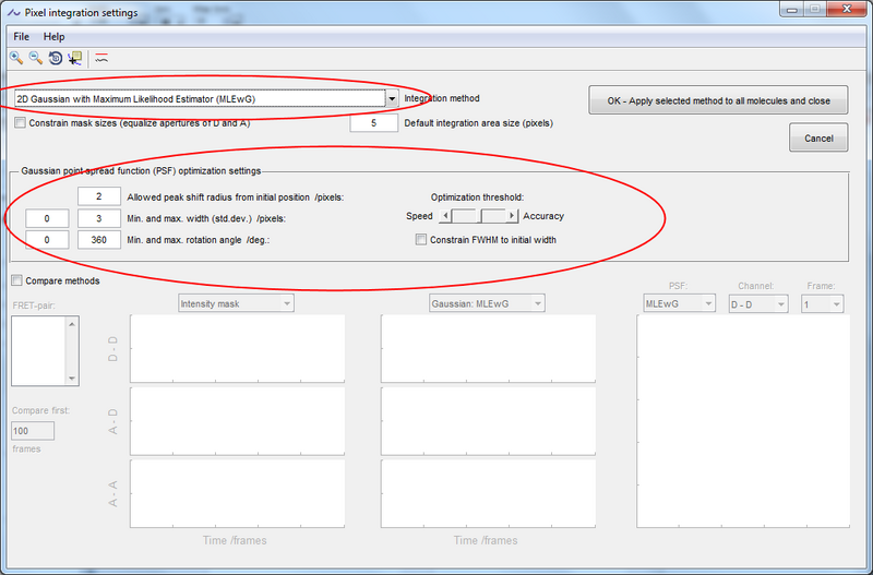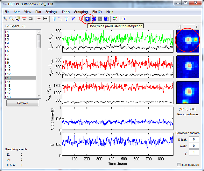 If the integration aperture (mask) of a molecule does not fit perfectly on to the molecule you can interactively define the integration mask of the molecule in the FRET-pair window.