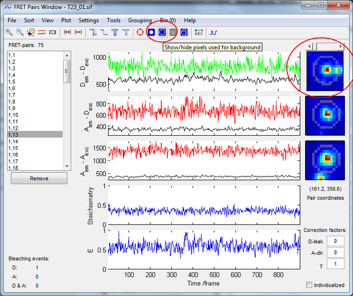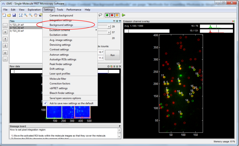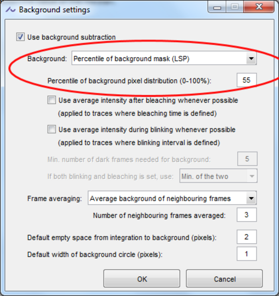 By default the molecule background is a ring mask surrounding the molecule. This background is calculated as the average of the intensity within the ring mask multiplied by the number of pixels in the integration mask.