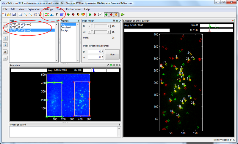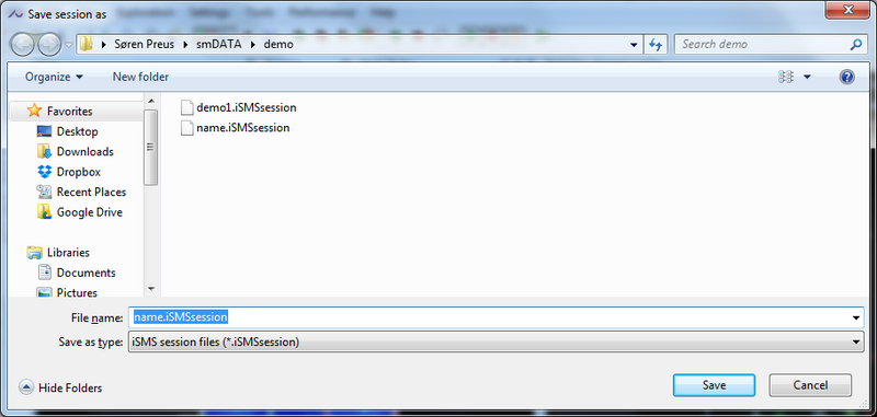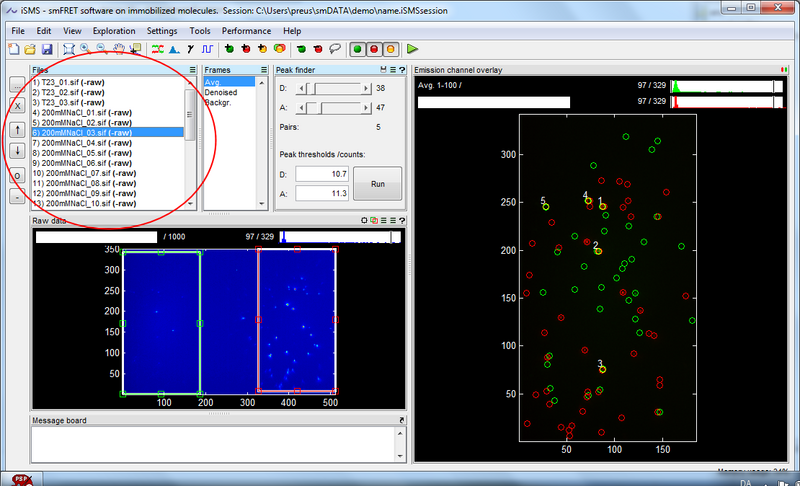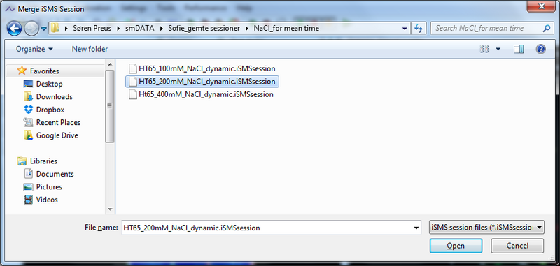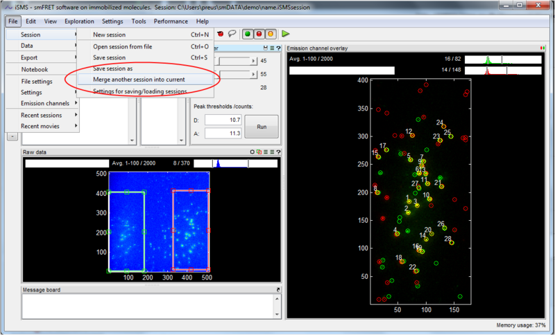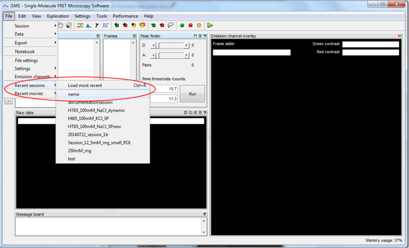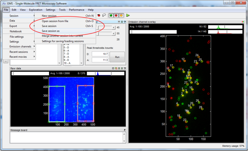 An iSMS session is a program state which includes all settings and processed data such as all FRET-pairs, traces etc.. iSMS sessions allow quick sharing of raw and processed single-molecule FRET data with PIs, collaborators and peers.
