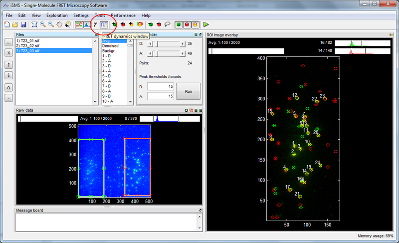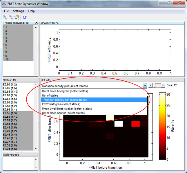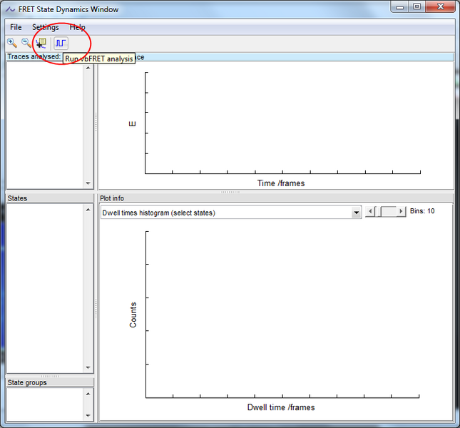 In the dynamics window, run vbFRET analysis by pressing the run button in the toolbar.