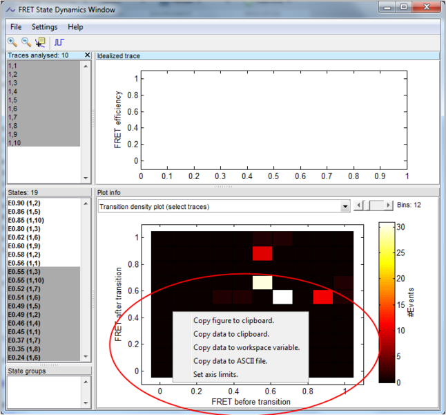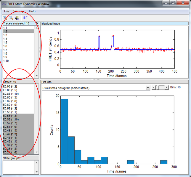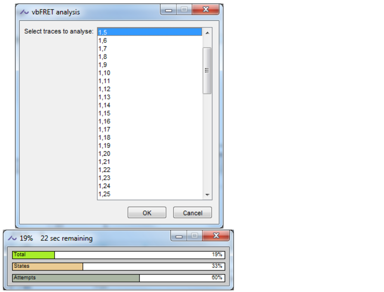 Once the analysis is finished the analysed traces will be listed in the upper listbox and all identified FRET-levels will be listed in the lower listbox.